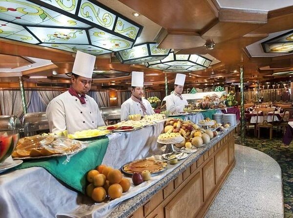 Disfrute de una cena bufé libre con una variedad de platos egipcios e internacionales mientras se relaja en un ambiente confortable. Durante la velada, disfrute de entretenimiento en vivo, incluyendo un espectáculo tradicional de danza del vientre, una actuación folclórica de Tanoura y relajante música oriental.